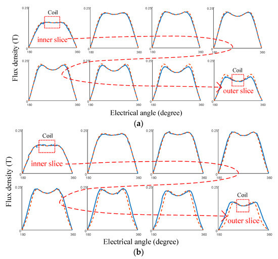 The results of eight slices calculated with the quasi-3-D models, and the correction function of the conventional Halbach array and VPAR-DHA, are shown in Figure 9. It was found that within the working range of the coil, the end-effect was effectively corrected, and the results are in good agreement with that of 3-D FEM, with errors of less than 5%.