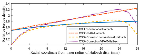 Figure 10 shows the relative torque density comparisons, considering the value at the inner radius to be 1. It can be seen that the end-effects weaken the torque output capability near the inner and outer radii. Moreover, compared with the conventional Halbach array, the maximum increase in torque density of the VPAR-DHA at the same radius is 2.2/1.8, and the output torque of the VPAR-DHA is enhanced. It indicates that the proposed VPAR-DHA can effectively increase the output torque capability without changing the rotor inertia.