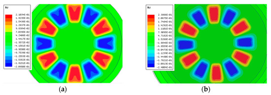 The flux density distribution of the axial and circumferential magnetized sub-arrays of the upper Halbach array can be expressed as Equations (12) and (13), respectively, by the separation variable method [14,18] with Equations (7)–(11). Equations (14) and (15) express the flux density distribution of the lower Halbach array. In Equations (12)–(15), and are the thickness of the PM and the yoke, respectively.