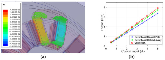 3-D FEM validation with armature reaction field: (a) Flux density distribution within the coil; (b) Output torque comparison.