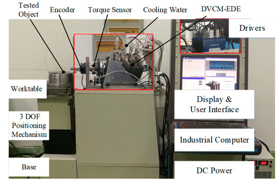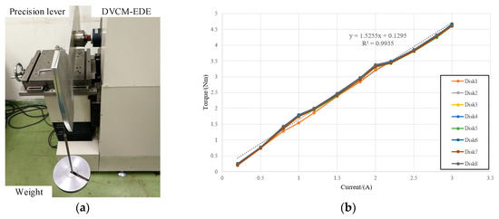 In addition, the static output performance was tested with a precision lever and weights when the coils were energized, as shown in Figure 14a. The prototype DVCM-EDE consisted of four DVCMs or eight coil disks. The relationship between the output torque and the input current of each disk is depicted in Figure 15b. The average torque constant of the coil disks was about 1.5255 Nm/A, which fit the FEM results well, and the minimum R2 value of the fitting curves was 0.9935. This demonstrated that the torque had an almost linear relation to current, which proved that severe saturation was very small in the magnetic circuit. Thus, stable torque could be achieved, and the controlled model was meanwhile simplified.