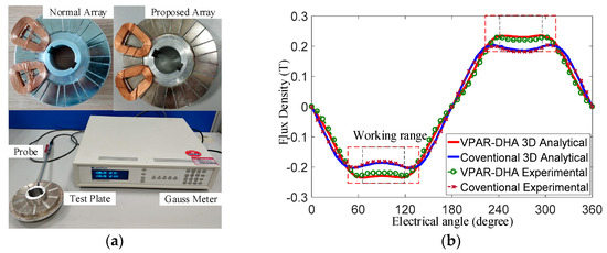 Experiments on flux density: (a) Halbach arrays; (b) Comparison of the analytical and experimental results.