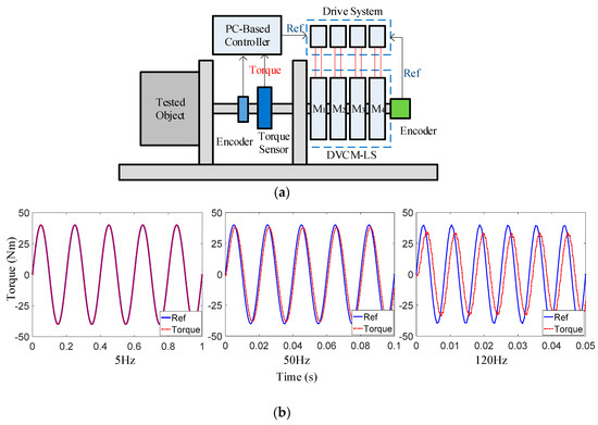The system construct of the prototype is shown in Figure 16a. Each DVCM was driven by an individual DC driver, controlled by a PC-based controller. The exciter worked at two modes: When testing the flexible object, it operated at a feedforward synchronous control method based on the CAN bus, according to its positional reference; while testing rigid objects, it realized the load torque closed-loop synchronous control with the torque sensor. The dynamic tracking responses of the prototype at a representatively low frequency (5 Hz, which is the servo bandwidth of many rotating machinery systems, such as industrial robots), mid-level frequency (50 Hz, which is also near the structural frequency of most rotating machinery systems), and high frequency (120 Hz, which is the performance limitation of the prototype) with a stroke of ±1° and peak dynamic torque 40 Nm, are evaluated in Figure 16b. As the dynamic performances of the prototype gradually changed with the increase of loading frequency, it shows that the DVCM-EDE had a good response of up to 120 Hz, with an amplitude reduction of less than 10%, and a phase lag of less than , which proved the high dynamic characteristics of the proposed exciter in high-frequency applications. For dynamic torsional stiffness test, as the dynamic angular displacement and the dynamic loading torque were directly acquired with the encoder and torque sensor for the calculation of the test results, the small phase lag of to reference the signal would not influence the measurement accuracy.