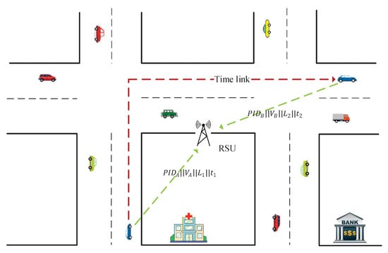 Although many efforts have been made to realize privacy-preserving traffic monitoring, most of them, nevertheless, ignore the time link attack, as described in Figure 1. Since vehicles are required to report their driving reports periodically or at different road segments, by linking their arriving time, vehicles’ trajectories can be easily identified. That is, the traditional technologies to protect drivers’ identity privacy, such as pseudonyms or randomizable signature, are not suitable in certain VANET-based applications. Besides, to preserve data privacy, cryptographic primitives such as elliptic curve cryptography [] and key and key aggregation are proposed [], which may introduce extensive workloads on the vehicles. Inspired by the work in [], we applied the use of super-increasing sequence to aggregate vehicles’ routes and speed information. In this way, vehicles’ identity and location privacy are preserved.