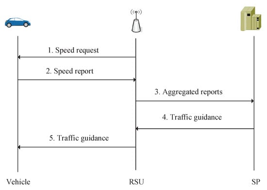 In our security model, TA is fully trusted as it is responsible for initializing the whole system and generating credentials and public/private keys for all participating entities. SP and RSUs are considered to be honest-but-curious, which means both will strictly follow the designed protocol, but are curious about vehicles’ privacy. In particular, we assume there is no collusion between SP and RSUs, which is similar to most existing RSU-assisted scenarios [,]. Meanwhile, we assume that vehicles will provide correct speed information to the RSU. This assumption is reasonable in most traffic monitoring scenarios, since: (1) the speed provided by vehicles is in the area where they have passed through, and providing false data would not benefit them; and (2) vehicles want to know the correct traffic conditions, and thus will honestly follow the designed protocol for their mutual benefits. Besides, we also assume there exists an attacker which is curious about drivers’ privacy. It may launch attacks, modify speed reports, and threaten data integrity. Based on the above assumptions, the proposed scheme should achieve the following security requirements.
