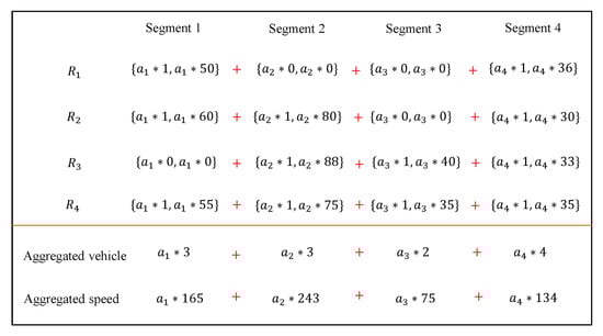For ease of understanding, we give an example to show how aggregated vehicle and speed are aggregated, as shown in Figure 4. The RSU receives the ciphertexts of four speed reports , each of which contains four segments. After performing the aggregations, the aggregated results of vehicle and speed are the ciphertexts of and , respectively, where . In the following, we show how to recover the aggregated vehicles and speeds for every segment.