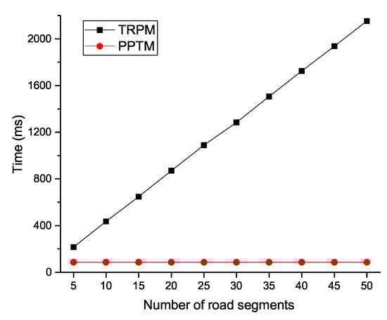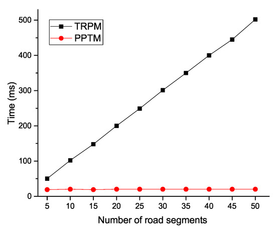 We list the computational costs of PPTM and TRPM in Table 1. In addition, we conducted extensive experiments to compare the efficiency of our proposed PPTM scheme. We used nodes with 1.5 GHz and 2 GB RAM as resource-constrained nodes (i.e., vehicles), and used a laptop with Intel Core i7-7600U CPU and 16 GB RAM as the entities that hold enhanced computational capacities (i.e., the RSU and cloud). The security number of and were set as 1024 bits and 160 bits. All experiments were executed 10 times, and the average results were selected. The experimental results indicate that each single multiplication operation in took 2 ms, each exponentiation operation in took 5 ms, and each pairing operation in took 2 ms. To validate the efficiency of our proposed PPTM, we show the computational costs in terms of the number of vehicles and road segments in Figure 5, Figure 6, Figure 7 and Figure 8.