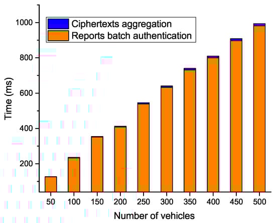 For the proposed PPTM scheme, when a vehicle generates an encrypted report , it performs two exponentiation operations in to calculate and , and one multiplication in to build the vehicle’s signature . After collecting vehicles’ reports, the RSU verifies the received reports with pairing operations. Besides, the RSU also aggregates vehicles’ reports to obtain the aggregated vehicle and speed information, which requires multiplication operations. However, since the multiplication operations in is negligible compared with the time-consuming exponentiation and pairing operations, the time costs can be omitted. In addition, to generate the signature, it also performs one multiplication operation in . As for the SP, it needs to verify the aggregated data sent from the RSU and obtain the aggregated data, which cost one pairing operation in and two exponentiation operations in . Here, we use to denote the computational cost of an exponentiation operation in , a pairing operation in , and a multiplication operation in , respectively. Then, the total computation costs for the vehicle, RSU, and SP will be , , and , respectively.