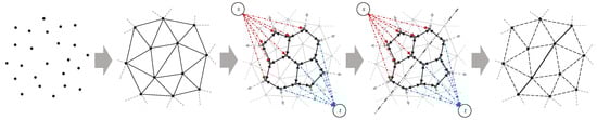 The typical visibility model as well as the energy formulation in Equation (1) described above is effective in most cases, but it has several flaws in relation to dense and noisy point clouds []. The surfaces reconstructed by [] tend to be overly complex, with bumps on the surface and handles inside the model. One possible solution to these problems is the soft visibility proposed in [], as shown in Figure 3b. In the soft visibility model, the basic assumption is similar to the previous typical visibility model. However, the edge weights are multiplied by a weight factor , in which d represents the distance between the point p and the intersecting point. In addition, the end tetrahedron in the soft visibility model is shifted to a distance of  along the line of sight.