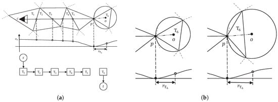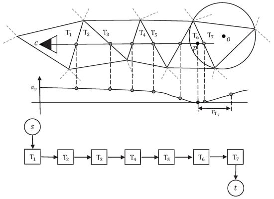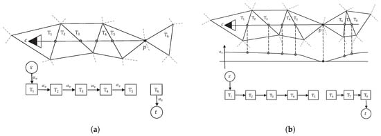 The typical visibility model [] assumes that, for each line of sight v, the space between camera center c and point p is free-space; the space behind point p along the line of sight is full-space. For the Delaunay tetrahedra of the point cloud, the tetrahedra intersected by segment  should be labeled as outside; the tetrahedron right behind the point p should be labeled as inside. For example, in Figure 3a, according to the above model, tetrahedra – should be labeled as outside, while tetrahedron  should be labeled as inside.