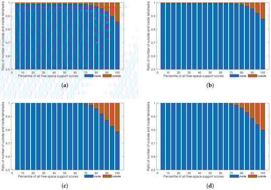 Free-space support analysis. The four graphs show the ratios of number of outside and inside tetrahedra in different percentiles of all free-space support scores. The four datasets are: (a) Fountain-P11 []; (b) Herz-Jesu-P8 []; (c) Temple-P312 []; and (d) scan23-P49 [].