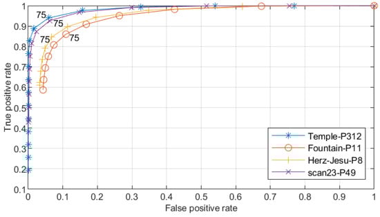 Note that the free space support threshold of 75th percentile was empirically set, as shown in Figure 6 and Figure 7. We generated dense point clouds of four datasets, and applyiedDelaunay tetrahedralization to them. The four datasets were Fountain-P11 [], Herz-Jesu-P8 [], Temple-P312 [] and scan23-P49 []. Then, we labeled the tetrahedra with method described in [], and took the result as the quasi-truth. Finally, we evaluated the ratios of number of outside and inside tetrahedra in different proportions of all free-space support scores, as shown in Figure 6. In Figure 6, we can see that, generally, tetrahedra with lower  ( lower than the 75th percentile of all free-space support scores) had a higher probability to be truly inside. As shown in Figure 7, the true positive rates and false positive rates with different free-space support thresholds were evaluated. It is noteworthy that, when the free-space support threshold was set as the 75th percentile of each dataset, both true positive rate and false positive rate were reasonable. Therefore, we only linked those tetrahedra to sink t whose free-space support was lower than 75th percentile of all free-space support scores. In Figure 5, we can see that the likelihood energy is helpful for filtering noise.