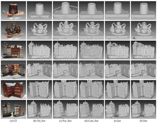 We first tested the proposed method on MVS dataset []. MVS dataset [] contains over one hundred scenes consisting of images depicting compact objects under controlled lighting conditions. Figure 10 shows the result on the MVS dataset []. The reference model is in the first column. From  the second column to the last column, there are the models of Tola et al. [], Furukawa and Ponce [], Campbell et al.  [], Jancosek and Pajdla [] and the proposed method, respectively. The final meshes given by Tola et al. [], Furukawa and Ponce [] and Campbell et al. [] were generated by Poisson surface reconstruction method [] and trimmed, which were provided in the benchmark MVS dataset []; the meshes of Jancosek and Pajdla [] were generated by OpenMVS, which contains an reimplementation of the method in []. Figure 10 shows that the proposed method could reconstruct complex scenes as well as regular scenes, and it had great potential for preserving scene details. Figure 11 shows the accuracy and completeness of reconstructed meshes over twenty scenes, which are scans 1–6, 9–10, 15, 21, 23–24, 29, 36, 44, 61, 110, 114, 118 and 122. The detailed information of the 3D models evaluated on MVS dataset [] is presented in Table 2. The evaluation method is described in [], in which accuracy is measured as the distance from the MVS reconstruction to the reference model, and the completeness is measured from the reference model to the MVS reconstruction. In addition to the evaluation of the surface, we also evaluated the point clouds generated by the methods in [,,] as well as OpenMVS, with the point clouds in [,,] provided by MVS dataset []. We can see in Figure 11 that generally the point clouds achieved better scores than the surface meshes, which complies with the results in []. The underlying reason could be that the mesh representation discarded points that are redundant but close to the true surface, and simultaneously fixed unexpected gaps. Comparing the result within the surface meshes, the proposed method without the dense visibility technique was not outstanding, in terms of both accuracy and completeness. By applying the dense visibility technique, the proposed method achieved the best median accuracy and median completeness, and the second best mean accuracy and mean completeness. In odd rows of Figure 12 are the local point cloud and the surface meshes of Jancosek and Pajdla [], the proposed method without the dense visibility technique and the proposed method; in the even rows of Figure 12 are the evaluation result (lower is better) of the corresponding local models through the method in []. We show the ability of the three methods to preserve thin objects and object edges. In some cases, the method in [] failed completely in reconstructing them; even the complete ones were less accurate, both visually and quantitatively, than those provided by the proposed method with or without the dense visibility technique. In addition, compared with the method in [], the proposed method showed a tremendous capability of preserving sharp object edges.