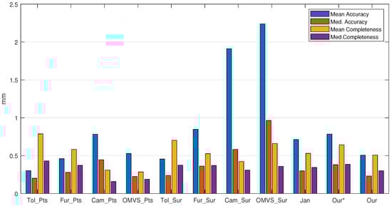 Quantitative evaluation (lower is better) of the methods on MVS dataset []. The abbreviations of the methods are given in Figure 10. In addition, OMVS is OpenMVS; Our∗ is the proposed method without the dense visibility technique; and ∗_Pts is the point cloud generated by method ∗.