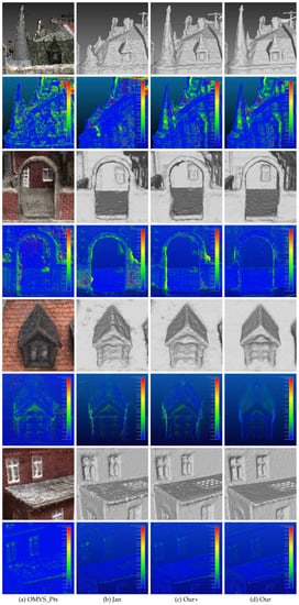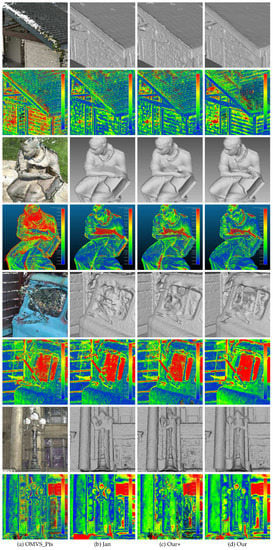 Detailed views of three methods on MVS dataset []. From left to right are: (a) the point cloud generated by OpenMVS; (b) the mesh of Jancosek and Pajdla []; (c) the mesh of the proposed method without the dense visibility technique; and (d) the mesh of the proposed method. In the even rows are the evaluation result (lower is better) of the corresponding local models in the odd rows through the method in []. The unit is mm for all numbers.