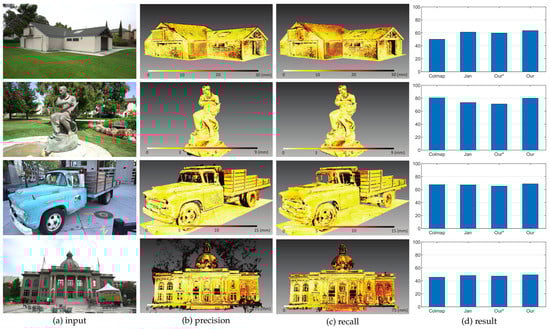 Result of the proposed method on four scenes of the training set of Tanks and Temples dataset []. From left to right are: (a) the input images; (b) the precision of the model generated by the proposed method; (c) the recall of the model generated by the proposed method; and (d) the evaluation result (higher is better) of the models generated by Colmap [] and three other methods depicted in Figure 10.