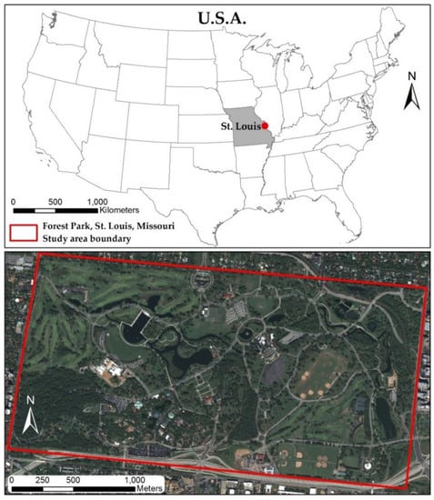 Study area located at Forest Park in St. Louis, MO, USA. The red border indicates the boundary of the park.