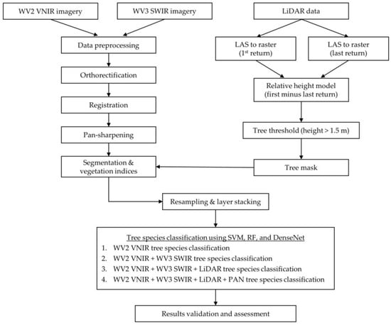 Figure 3 presents the flowchart of the urban tree species classification procedure using machine learning algorithms. The procedure consists of four steps: (1) data preprocessing; (2) tree crown area extraction; (3) shadow/background removal; and (4) tree species classification using machine learning algorithms SVM and RF and DenseNet. In order to evaluate the effect of data dimensionality on urban tree species identification, four classification schemes were tested: (1) classification based solely on the WV2 VNIR bands; (2) WV2 VNIR with WV3 SWIR bands; (3) WV2 VNIR, WV3 SWIR and LiDAR intensity image; and (4) WV2 VNIR, WV3 SWIR, LiDAR intensity and incorporation of the very high spatial resolution panchromatic (PAN) band from the WV2 dataset. An accuracy assessment was then performed for each classification scheme.