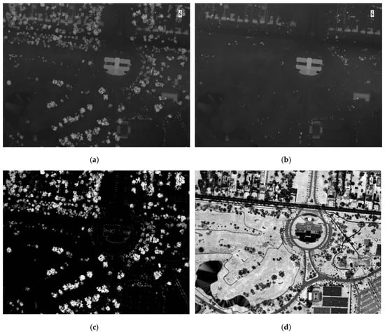 LiDAR data can be used to extract certain biophysical tree parameters essential for sustainable forestry management, such as, diameter at breast height (DBH), forest biomass, forest density, crown base height and tree height [,,]. Ground truth tree height values have been compared to LiDAR derived tree height and were found to exhibit high r2 values, 0.85–0.95, thus establishing LiDAR as a valid technique to obtain tree height []. The height of trees can be determined by creating two files from the LiDAR dataset: a digital terrain model (DTM) and digital surface model (DSM). The DTM consists of the last returns of a LiDAR dataset and represents the bare earth. The DSM consists of all other returns and represents features on the surface of the earth. Subtracting DTM values from their corresponding DSM values is an accepted method for establishing the height of landscape features such as trees [,]. A similar approach was applied by converting LAS point cloud data into first return (Figure 4a) and last return (Figure 4b) raster images representing DSM and DTM raster images, respectively. By subtracting last return LiDAR raster from first return LiDAR raster, a relative height raster image depicting objects within the scene is produced (Figure 4c). Additionally, a LiDAR intensity return image (Figure 4d) was created to examine the usefulness of return intensity, a measure of object reflectivity, for distinguishing tree species. To extract tree-related information, a mask was created to exclude objects below 1.5 m, eliminating shrubs and flat or low-pitched roofs, and above 35 m, corresponding to the maximum height of native trees as well as excluding tall buildings and structures. This approach is effective in an urban area due to its ability to exclude buildings and houses, where most the remaining information relates to the relative height and intensity returns from woody vegetation.