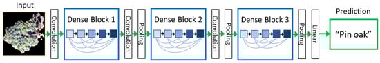 As a subfield of machine learning, deep learning (DL), which attempts to model high-level abstractions in data using a hierarchal manner, has gained recent popularity in the remote sensing field for its ability to characterize complex patterns within imagery datasets. Similar to the function of the deep architecture of the human brain, deep learning algorithms formulate learning models that construct natural relationships between input and output data through deep architecture comprised of multiple layers of nonlinear transformation operations []. Contrary to the popular object-based approach to individual tree species classification, deep learning eliminates the hand-crafted feature extraction step, by examining the local spatial arrangement and structural patterns characterized by the low-level features []. Deep learning has demonstrated superior results over other commonly used classifiers for scene classification [,] as well as outperforming other methods in 3-D LiDAR tree species classification []. This study examines one of the latest neural networks for visual object recognition, Dense Convolutional Network (DenseNet), and its ability to classify dominant tree species within a highly complex urban environment using a data fusion approach with high spatial resolution multispectral imagery and LiDAR datasets. Recent studies have demonstrated DenseNet outperforms other deep learning architectures such as Inception, VGG and ResNet through achieving higher classification accuracies with fewer input parameters [,,]. While deep learning has recently exhibited success for individual tree detection [], crop classification [] and hyperspectral image classification [], DenseNet has not been examined for its utility for individual tree species classification, to our knowledge.