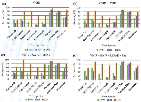 Overall accuracies for individual tree species using SVM, RF, and DenseNet (DN) classifiers using (a) eight VNIR WorldView-2 bands, (b) 8 VNIR WorldView-2 bands plus eight SWIR WorldView-3 bands, (c) eight VNIR WorldView-2 bands plus eight SWIR WorldView-3 bands plus LiDAR intensity return image and (d) eight VNIR WorldView-2 bands plus eight SWIR WorldView-3 bands plus LiDAR intensity return image plus WorldView-2 panchromatic band.