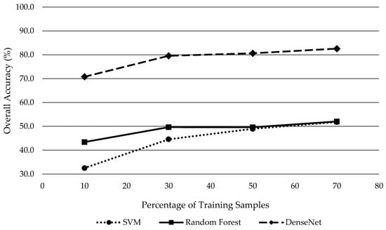 Deep learning algorithms typically require a large sample set to build an effective model. Therefore, it was our hypothesis that while deep learning algorithms such as DenseNet outperform other machine learning classifiers given a robust sample dataset. In order to test the effect of the number training samples on classifier performance, each classifier’s ability to handle limited training samples was examined. The same training samples were used for each classifier to compare classifier performance against a matching set of variables. The results are displayed in Figure 8. A uniform percentage of the total samples for each tree species was chosen at twenty percent intervals starting at 10% and ending at 70%. The results are presented in Table 9.