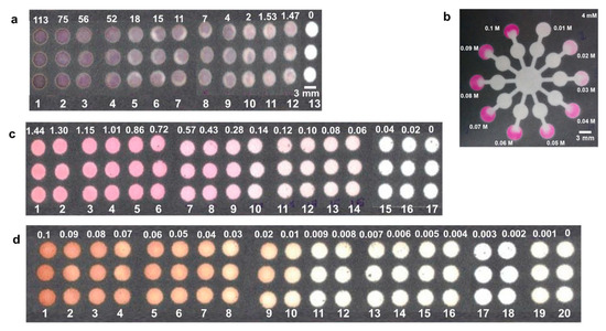 A four-star and six-star channel design was used to demonstrate pH testing using four common pH indicators namely, phenol red, bromophenol blue, chlorophenol red, and bromocrescol green to implement on paper microfluidics (see Supplementary Information for the detailed protocol and mechanisms of action). All these dyes are yellow at pH 3 and changes to a different color with increasing pH. One drop of 1.5 μL of these pH indicators were loaded on the pH sensing zones (outer labelled circles) (Figure 2) and dried at room temperature. After drying another drop of 1.5 μL of the different pH indicators solutions were added on the same spot for producing brighter color palettes. All the experiments were performed in triplicates at room temperature of ~25 °C with relative humidity of 50%. The pH test was further evaluated by introduction of 10 μL of citric acid (Figure 2c) and sodium nitrite (Figure 2d) at the center of the star shaped channels. An array of circular channels was designed to demonstrate testing of ascorbic acid, nitrite, and glucose. For ascorbic acid test, the reagents were casted on the circular channels sequentially and dried at room temperature. For example, 0.5 μL of potassium iodide was introduced after drying 0.5 μL of potassium iodate followed by addition of 1 μL of starch reagent. After this, one drop of 1 μL of ascorbic acid was introduced. For nitrite test, one drop of 1.5 μL of Griess reagent was introduced in the circular channels. For making brighter colors multiple drops of Griess reagent maybe added. Upon drying, one drop of 1 μL of sodium nitrite was dropped. For glucose test, one drop of 1 μL of 1.2 M potassium iodide was spotted, followed by spotting one drop of 1 μL of horseradish peroxidase: glucose oxidase (1:5 ratio) on the circular area. Upon drying, one drop of 1 μL of glucose was dropped. The limit of detection (LOD) was projected from the image sets of arrays with varying concentrations for ascorbic acid from 0–0.11 mM, nitrite from 0–1.4 mM, and glucose from 0–100 mM, respectively. The lowest analyte concentration at which a visible color change can be observed and after which no more changes could be seen was considered as the detection limit [22,23]. For citric acid assessment, a ten-star shaped channel was designed as shown in Figure 3b. The outer circles (detection zone) were spotted with 1 μL of phenolphthalein, and the middle circles were spotted with various concentrations of 1 μL of sodium hydroxide. After drying 10 μL of 4 mM citric acid was introduced in the center circle. All the experiments were performed in triplicates at room temperature. The Supplementary Information document explains the detailed reaction mechanism of action for each reagent.