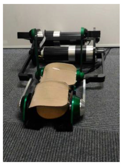 The duration of the evaluation and training period took approximately two months. The training sessions were conducted four times within one month, in sets of eight, twice in one session. The interval time was 1 min between each set. In this study, we conducted a cross-over comparison test to determine the training effects of the robot as shown in Figure 7. Subjects were randomly divided into two groups. In the first month, one group conducted training with the training robot. This phase is referred to as the training phase. On the other hand, the other group did not engage in training. This phase is referred to as the control phase. One month later, the two groups were interchanged and the same process was carried out. The first and latter halves were defined as the first intervention period and the last intervention period, respectively. The number of training times was set to four, and evaluation was conducted three times: before and after the first intervention period and after the last intervention period.