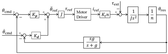 Figure 2 shows the control system of the training robot. The robot can control the angle and height from the ground to the footplate. It can be considered as a velocity control system with a PI controller. Table 2 shows parameters of the control system. Kp and Kd denote the position and velocity gains, respectively. denotes the angle of motors. J, i, g, and n denote inertia of moment, motor current, cutoff frequency of pseudo derivative, and reduction ratio of the gear, respectively. Res, cmd and ref in the subscripts denote response, command and reference values, respectively. and kt denote external torque and torque constant, respectively. This study considered only the dorsiflexion and plantar flexion of the ankle joint; therefore, the angle of the rear motor controlling the ankle height remains constant, and a wave input is provided to the front motor controlling the tip height. With such a controller, dorsiflexion and plantar flexion of the ankle joint can be achieved while maintaining a constant heel position.