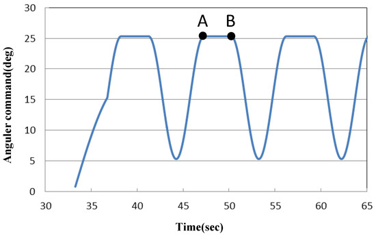 As shown in Figure 4, during training, the trainee sits on a chair. The training robot is installed under the chair, and one foot is fixed to the training robot footplate with a band. The display in front of the trainee visualizes the force applied at the tip of the toe as a filled yellow circle, the radius of which is related to the amount of the force in the dorsiflexion direction (Figure 5). The trainee is asked to adjust the force so that the filled yellow circle matches a red circle, which displays the amount of target force. The red circle is displayed only when the angular command moves in the plantar flexion direction. Constant eccentric contraction force is achieved with the trainee adjusting the force on the tip of the toe while the robot moves in the plantar flexion direction. The angle provided to the front motor is shown in Figure 6. Initially, the two motors keep the footplate at dorsiflexion position. When both actual angles exceed these angles, the rear motor angular command maintains the current angle. By lifting the footplate, an ankle joint movement range is obtained. Next, the angular command of the front motor begins moving in a sine wave-like signal, as illustrated in Figure 6. The amplitude of this wave is calculated based on the ROM of the subject’s ankle. When the command input signal reaches the sine wave peak, the command input remains constant for a few seconds (point A). Finally, the front motor command falls. At this moment, the subject is still required to maintain the target force value mentioned previously (point B). As a result, training is accomplished with both the preferred strength and speed. It has been already shown in [18] that the reproducibility of the eccentric contraction force improves during the movement with the force bio-feedback loop. It is highly possible that such a training also has a higher clinical effect on the motor control performance of eccentric contraction because of the higher reproducibility of force during training.