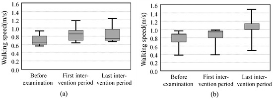 Walking speed during 5-m walking test. (a) Group A; (b) Group B.