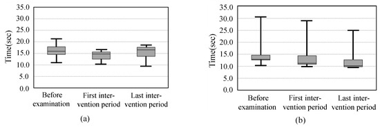 Figure 8 shows the walking speed during the 5-m walking test. The left figure (group A) shows the trend toward higher speed after the first intervention period. On the other hand, group B had higher speed after the last intervention period. However, there was no significant difference between each period.