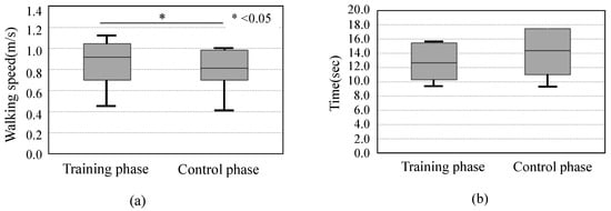 Figure 10 shows the walking speed and TUG time between the training and control phases among all the subjects together. A significant difference was observed in the 5-m walking test (p < 0.05). However, there was no significant difference in the TUG time.