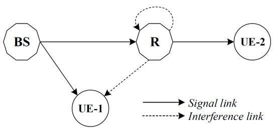 We assume a dual user NOMA scheme in which the BS directly transmits the message to the UE–1 while UE–2 is assisted by a FD relay with a DF relaying protocol as we showed in Figure 1.