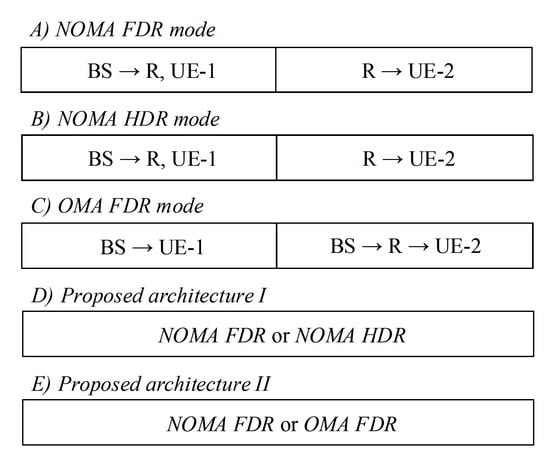 In this paper, as in Figure 1 we consider the case of down link NOMA in Internet of Things (IoT) system where two client users including near user denoted as UE–1 and far user denoted as UE–2. Such model is very popular in applications deployment of IoT where massive connections are served simultaneously. Both the users are served by a master node operated as base station (BS) at the same time and frequency, but with different power levels. Due to the far distance between UE–2 and BS, we assume FD cooperative relaying, where FD relay R assists the communication between BS and UE–2. As an illustration in Figure 2, regarding time slots are assigned for these traditional models as NOMA FDR mode, NOMA HDR mode, OMA FDR mode, they require to allocate two time slots for their transmission while our proposed architecture need only time slot for hybrid scheme. These transmission modes are described in many works [32,34]. It is noted that power domain multiplexing in NOMA can be efficiently performed by deploying superposition coding at the receivers.