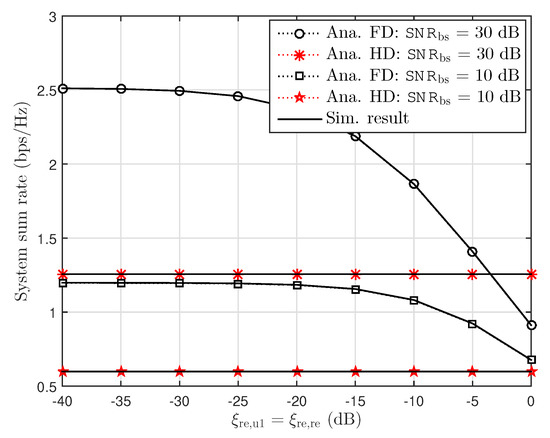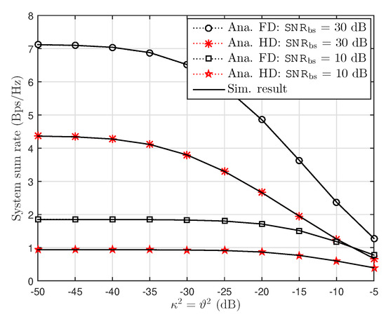 Figure 6 examines the effect of level of RHI on system sum rate. It can be seen clearly that higher level of noise due to imperfection of hardware is main reason to show decreasing sum rate. At small amount of RHI, the ceiling sum rate can be observed, however, sum rate is small as is greater than –10 (dB). In this situation, FD performance is better than HD at dedicated SNR at the BS.
