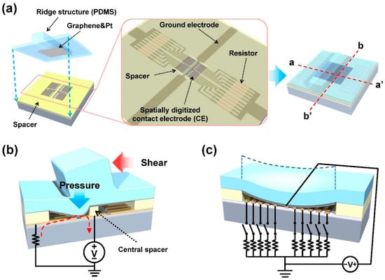 Schematic illustration and operating mechanism of the tactile shear sensor: (a) schematic diagram of the sensor; (b) 3D cross-sectional image along a-a’ in (a), showing the shear sensing mechanism; (c) 3D cross-sectional image along b-b’ in (a), showing a short-circuit with multiple electrodes making contact with the graphene layer.