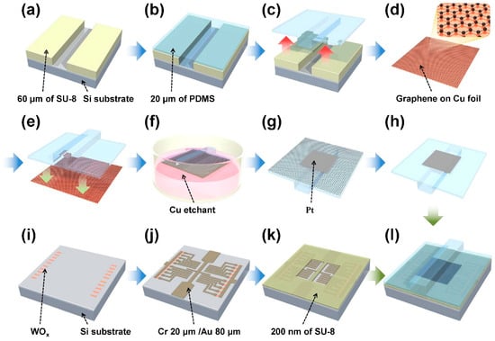 Figure 2 shows illustrations of the fabrication process. The fabrication process can be divided into two parts, one for the top layer with a ridge structure and the other for the bottom substrate. For the top layer (see Figure 2a–h), we used a molding technique starting with a silicon substrate that had a 60 μm thick SU-8 ridge master pattern defined using optical lithography. Then, a 20 μm thick polydimethylsiloxane (PDMS) was spin-coated on the master and cured. The CVD-grown graphene on Cu foil (Graphene Square Inc., Seoul, Korea) was transferred to the bottom of the ridge-molded PDMS layer. A thin layer (20 nm) of Pt was deposited using a stencil mask and thermal evaporation to reduce the contact resistance and to increase the mechanical stability under repeated contact operation. Then the graphene was etched by O2 reactive ion etching, using an evaporated Pt electrode as a hard mask. The bottom substrate fabrication processes (see Figure 2i–k) begin with the defining of the WOx resistors (~1.7 kΩ). The resistors were patterned by electron-beam (e-beam) lithography and 30 nm of W was sputtered in an oxygen atmosphere. The CEs and ground electrode were also patterned using e-beam lithography and 20 nm Cr/80nm Au that was deposited by thermal evaporation. A 200 nm thick spacer was fabricated with SU-8 2002 diluted to 1/4 in SU-8 thinner. Commonly, SU-8 is used as a negative photoresist. However, SU-8 can occasionally be used as a negative e-beam resist due to its cross-linking characteristics induced by the e-beam []. Finally, as shown in Figure 2l, the fabricated top layer was aligned and attached to the patterned bottom substrate.