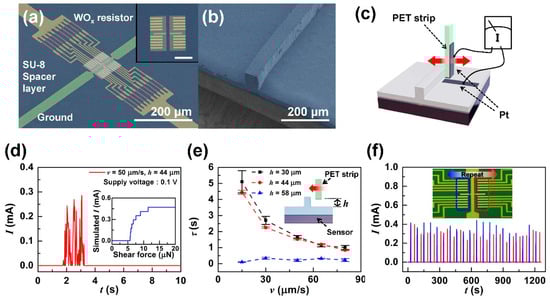 To determine how the contacting height on the ridge structure and how the contact speed affects sensor output characteristics, we investigated the sensor’s response under various contact speeds and heights. Figure 3e shows the duration τ of the sensor current responses with various contact speeds v and PET contact heights h. Each scan was repeated five times. For h = 30 μm and 44 μm, we observed that the higher the contact speed, the lower the signal duration, which reflects the reduced contact duration with contact speed. When h = 58 μm, we observed that τ was very low regardless of v. This was due to the minimal frictional force between the ridge and the strip, resulting in insufficient torque applied to the ridge. When shear scanning was repeated back and forth, the right and left CEs detected the shear, alternatively demonstrating that the tactile shear sensor was able to detect 6~11 μN shear forces in both directions (Figure 3f). The slightly lower average level of output current for the right scan direction may be from the Pt deposited on the right surface of the PET reducing friction with the PDMS ridge.