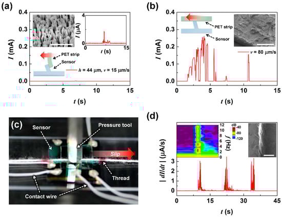 For applications that require the detection of grip and slip, most systems rely on the time dependent variation in the detected tactile pressure to infer that a slip event has occurred [,]. Here, we demonstrate that our sensor is able to detect the pulling of a softly held thread, without the need to detect changes in tactile pressure. We placed a polyester thread on the sensor surface perpendicularly to the ridge structure with 100 Pa vertical pressure (see Figure 4c), mimicking a string being held at minimal force between two fingers. When the polyester thread was pulled with no change in the applied vertical pressure, resulting in slip (at 2 mm/s speed for 2 s period in 10 s of intervals), we measured the time dependent fluctuation in the sensor’s current output, coinciding with the moment of slip, as can be seen in Figure 4d, demonstrating the sensor’s ability to detect slip. For a more detailed analysis, we converted the absolute value of the time-dependent current differential to the signal frequency amplitude using short-time Fourier transform (STFT), as shown in the left inset of Figure 4d. In the 10~12 s of STFT, we observed a primary peak at about 2 Hz and also in its harmonics. Considering the frequency peak f determined by the relationship between contact speed v and surface period λ, f = v/λ, the primary peak can be understood as that caused by ~1 mm periodicity of the surface structure of the thread periodically running over the sensor ridge structure. The measured surface period was confirmed by the observed surface period in the winding of the thread seen from the SEM image of its surface (see the right inset of Figure 4d).