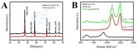 Typical XRD patterns (A) of 3D Au-rGO/FTO and Au/FTO, and Raman spectra (B) of GO/FTO, Au/FTO and 3D Au-rGO/FTO.