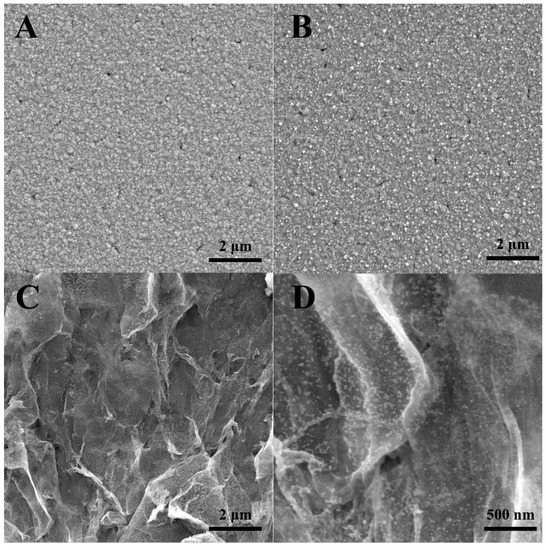 Figure 2 displays the SEM images of Au/FTO and 3D Au-rGO/FTO. Compared with the SEM image of FTO (Figure 2A), the AuNPs (Figure 2B) had been deposited on the FTO via the CV procedure. Figure 2B indicated that AuNPs were well-dispersed onto the FTO substrate in a high density. Figure 2C presents the SEM image of 3D Au-rGO/FTO which suggests that when GO was included in the electrolytes, the 3D Au-rGO could be electrodeposited on FTO via a one-step synthesis. Subsequently, the as-prepared AuNPs in the electrolytes with GO become smaller than that without GO, because GO could reduce the growth rate of AuNPs through influencing the diffusion of AuCl4− on the surface of FTO. The SEM of 3D Au-rGO/FTO with higher magnification is profiled in Figure 2B. As could be seen, GO was well-dispersed with the assistance of AuNPs and a three-dimensional network structure was constructed with wrinkle-like rGO and AuNPs which was beneficial to the transfer of electrons in electrochemical analysis.