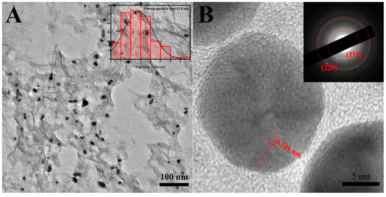 TEM was performed to investigate the morphology of 3D Au-rGO/FTO in detail. The TEM micrographs of 3D Au-rGO (Figure 3A) confirmed that AuNPs were well-distributed over the rGO and the average particle size of AuNPs were approximately 13.8 nm in diameter (from the inset in Figure 3A). AuNPs with small size were obtained, because the Cl− in the electrolyte could complex with Au3+ to accelerate the dissolution of Au in large amounts at the high potential, which hindered the further growth of AuNPs.