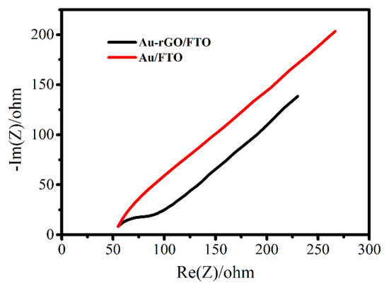 Electron transfer kinetics of different modified electrodes were investigated by EIS in solutions containing 5 mM K3Fe(CN)6. The diameter of the semicircle in the high frequency range implies the electron transfer resistance (Rct), which characterized the electron transfer kinetics of the electrochemical reaction. A comparison of the EIS of 3D Au-rGO/FTO and Au/FTO (Figure 4) showed that the semicircle diameter of Au/FTO was larger than that of 3D Au-rGO/FTO, which suggested faster electron transfer kinetics of 3D Au-rGO/FTO than Au/FTO. The above results could be explained as follows: rGO, with its excellent electrical conductivity properties and the structure of the composite could provide a conductive network to enhance the transfer of electrons in electrochemical reactions.