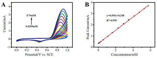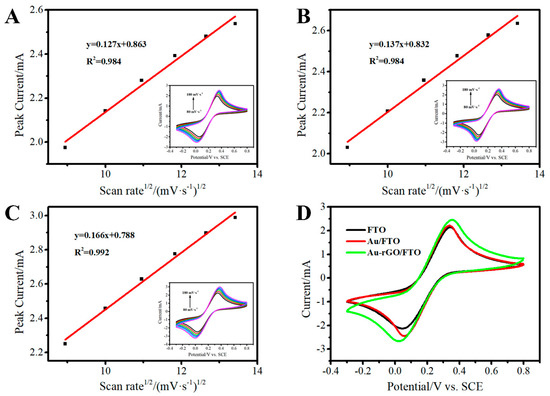 The calibration curves of the oxidation peak currents versus the square of the scan rate of FTO (Figure 5A), Au/FTO (Figure 5B) and 3D Au-rGO/FTO (Figure 5C) were obtained from the CV results at different scan rates. As could be ascertained from the slope, that the electroactive surface area of 3D Au-rGO/FTO (0.075 cm2) was increased by 21% compared that of Au/FTO (0.062 cm2). However, the electroactive surface area of Au /FTO was only increased by 7% compared that of FTO (0.058 cm2). The CV test in 1 M NaOH (Figure S2) was used to estimate the actual area of 3D Au-rGO/FTO. According to the calculation results, the actual area of 3D Au-rGO/FTO was much larger than the active area of the electrode, because rGO was well dispersed on the surface of the FTO electrode and formed a large number of folds, which were mainly used for the construction of the three-dimensional network structure and promoted the dispersion of AuNPs. This signified that the usage of rGO was an important factor to increase the electroactive surface area due to the large specific surface area of rGO and the good dispersion of Au on the surface of rGO.