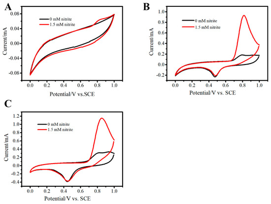 CVs of FTO (A), Au/FTO (B), 3D Au–rGO/FTO (C) in the 0 mM nitrite (black line) and 1.5 mM nitrite (red line) in PBS. Scan rate: 100 mV/s.
