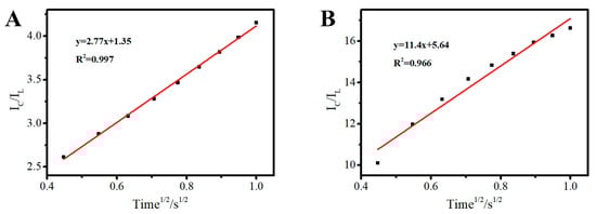 The calibration curves of versus the square of time based on chronoamperometry with Au/FTO (Figure 7A) and 3D Au-rGO/FTO (Figure 7B) are given in Figure 7. 3D Au-rGO/FTO with a slope of 11.4 and Au/FTO with a slope of 2.77 are presented in Figure 7. In another word, the plot of 3D Au-rGO/FTO is 4.1 times than the plot of Au/FTO, which implied the of 3D Au-rGO/FTO (27.6 mM−1 s−1) is about 17 times than the of 3D Au-rGO/FTO (1.63 mM−1 s−1). Therefore, the higher sensitivity of 3D Au-rGO/FTO toward nitrite than that of Au/FTO was attributed to the faster electrochemical reaction.