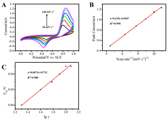CVs of the 3D Au-rGO/FTO in PBS containing 1.5 mM nitrite at scan rates from 20 to 120 mV s−1 (A), the plots of anodic peak currents to the square root of scanning rates (B), anodic peak potentials versus (C).