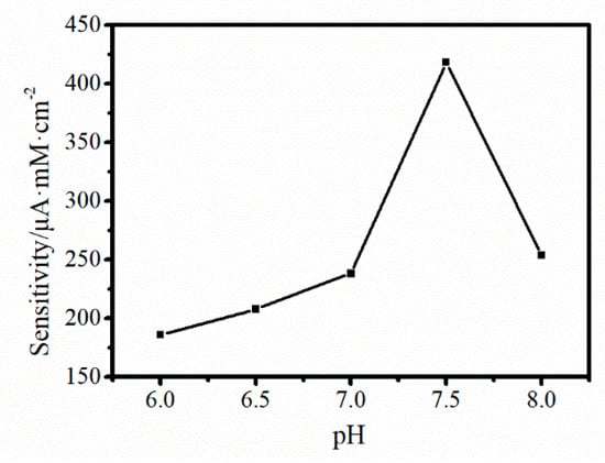 According to the Equation (5), H+ was one of reactants in the oxidation of nitrite, so the electrochemical reaction will be affected by the concentration of H+. In another word, pH was a vital factor to change the rate of oxidation of nitrite. Hereby, sensitivity for detection nitrite was surveyed (Figure 9) in order to optimize the testing condition for detection of nitrite. As could be seen in Figure 9, the sensitivity was increased with the rise of the pH from 6 to 7.5 and decreased at the pH 8, and the maximum sensitivity was obtained at pH 7.5. Therefore, the pH 7.5 was selected as the optimum pH value in our experiments.
