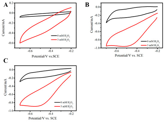 CVs of FTO (A), Au/FTO (B), 3D Au–rGO/FTO (C) in 0 mM H2O2 (black line) and 3 mM H2O2 (red line) in PBS. Scan rate: 100 mV/s.